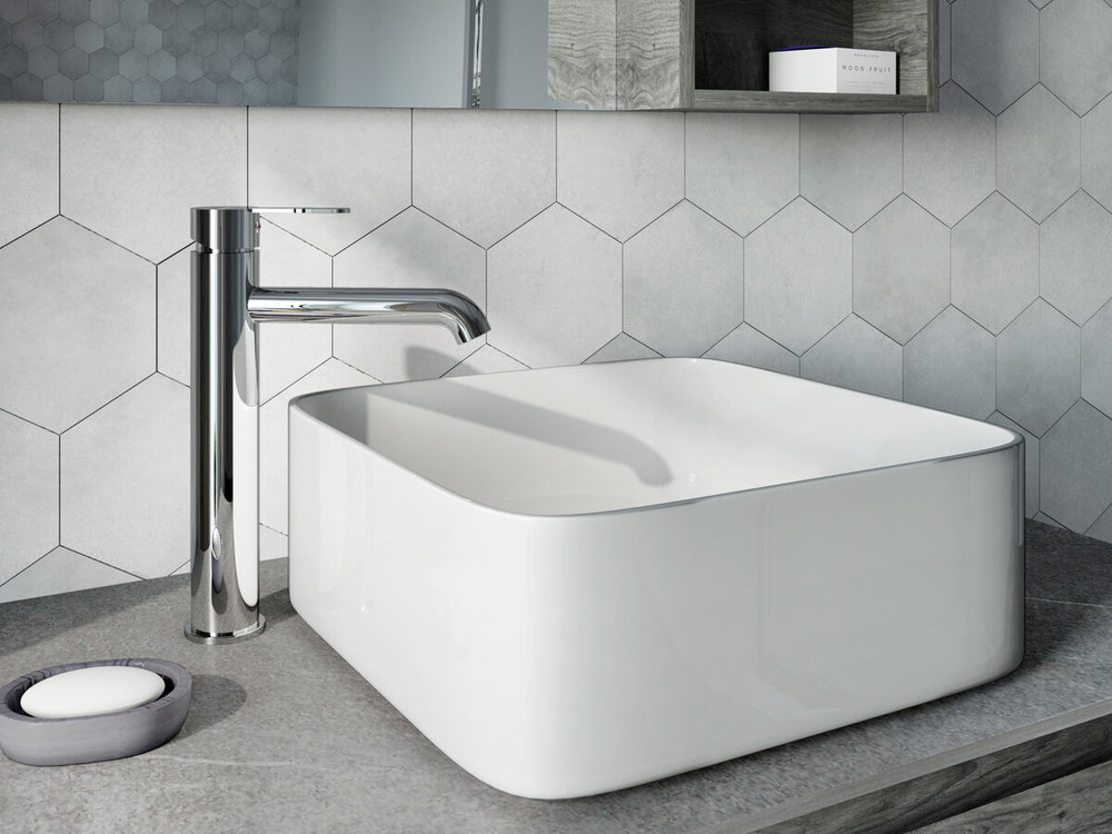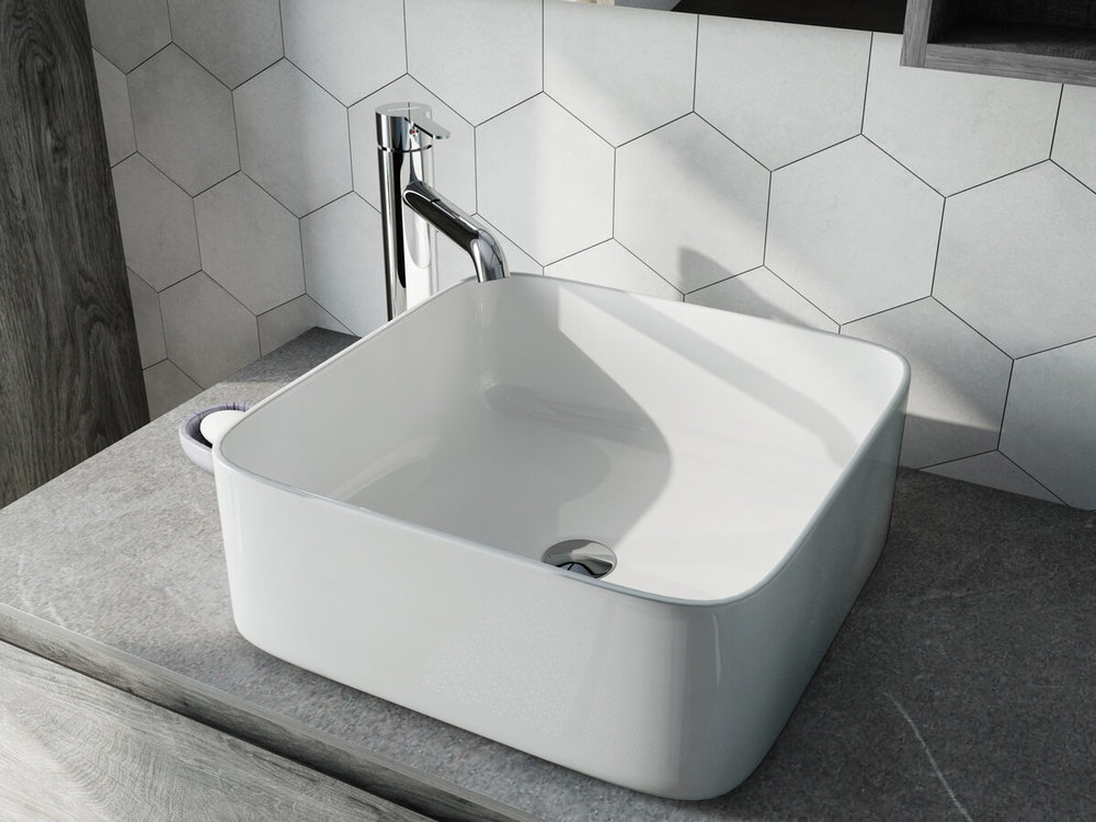 Оптимальным вариантом для накладной раковины станет смеситель Stworki «Стокгольм HFSG02200». Его особенность — высокий длинный излив, удобный для проведения водных процедур. Стабильную работу и легкое управление обеспечивает картридж на основе керамики Damixa. Прочность и зеркальный блеск дарит глянцевое покрытие High Gloss