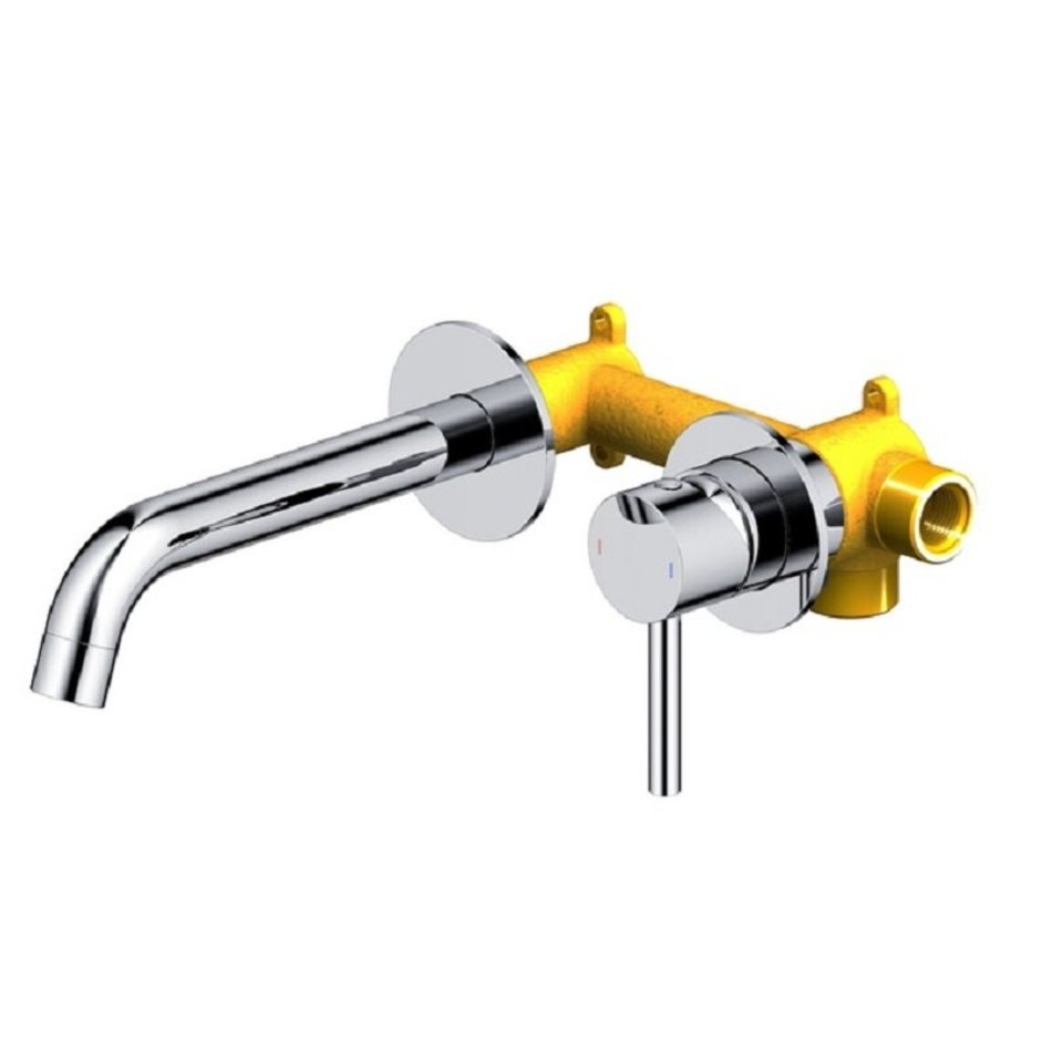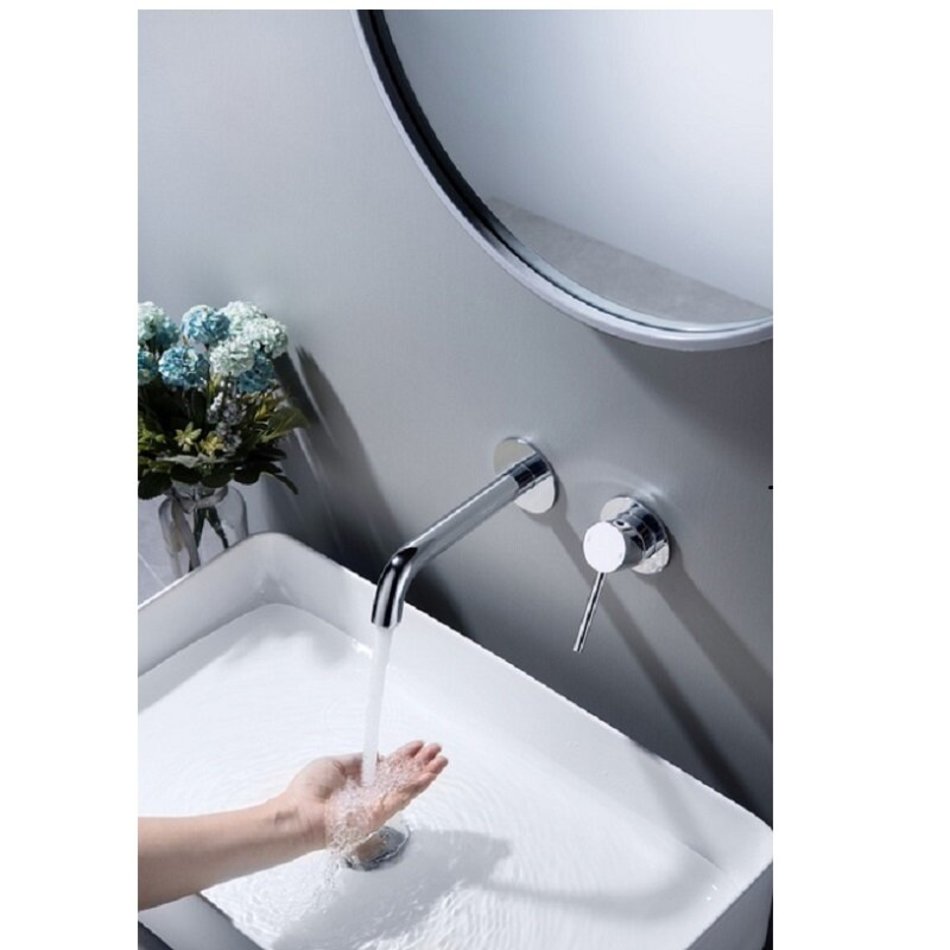 Настенный смеситель для раковины (хром). Встраиваемый смеситель предназначен для монтажа в твердой или полой стене. Основные преимущества встроенного смесителя: коммуникации, крепления и механизмы спрятаны в стену и видны только декоративные элементы, установить встроенный смеситель можно в любом месте. Регулировка температуры и напора воды осуществляется одним рычагом. Сложностей монтажа не возникает при установке смесителя опытным сантехником. Внимательно изучите инструкцию по монтажу и эксплуатации. Комплектация: Смеситель скрытого монтажа - 1 шт.; Излив - 1 шт.; Декоративные накладки смесителя и извива (латунные) - 2 шт.; Ручка смесителя - 1 шт.; Ключ шестигранный - 1 шт.; Инструкция - 1 шт.
