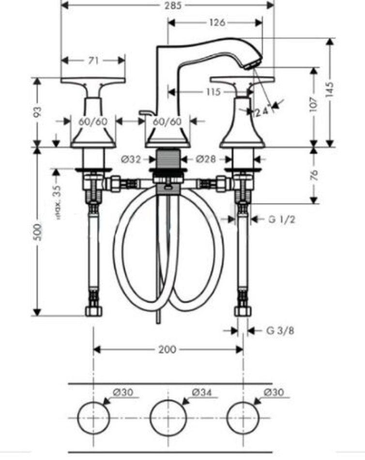 - состоит из: смеситель для раковины, на 3 отверстия, слив/перелив