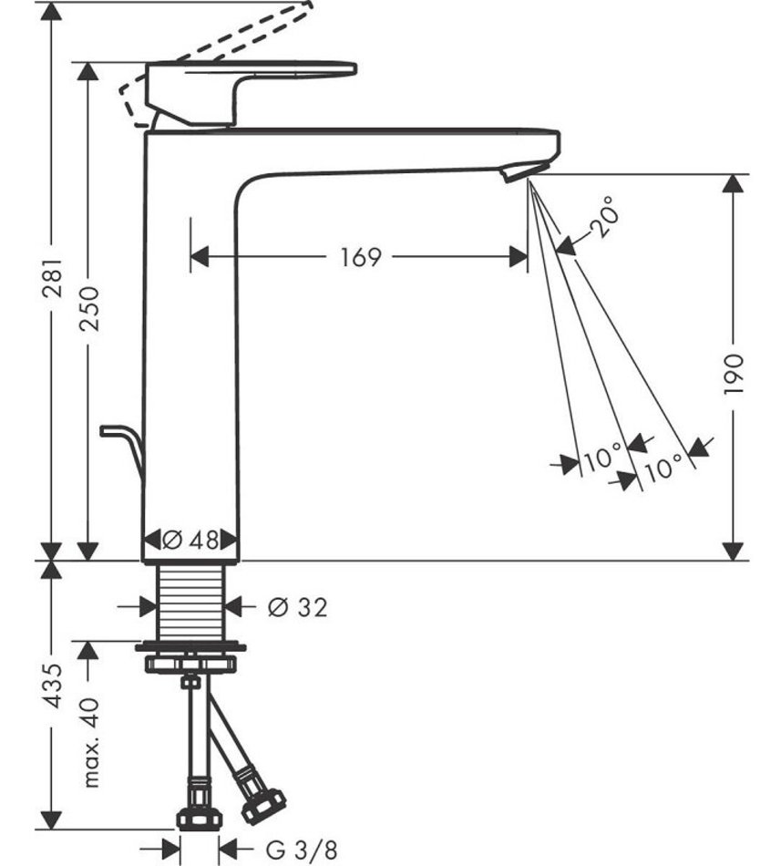 - состоит из: высокий однорычажный смеситель для накладной раковины, слив/перелив