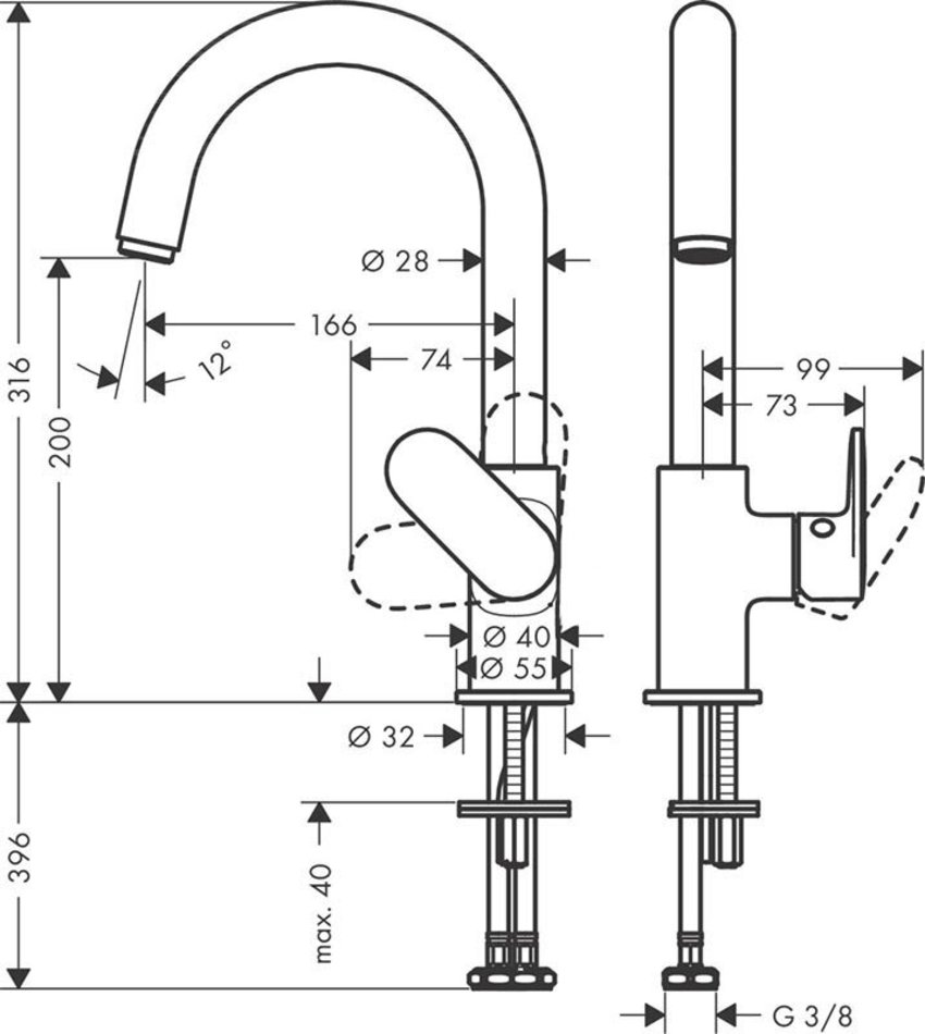 • угол поворота излива: регулировка на 2 уровня на 120° или 360°