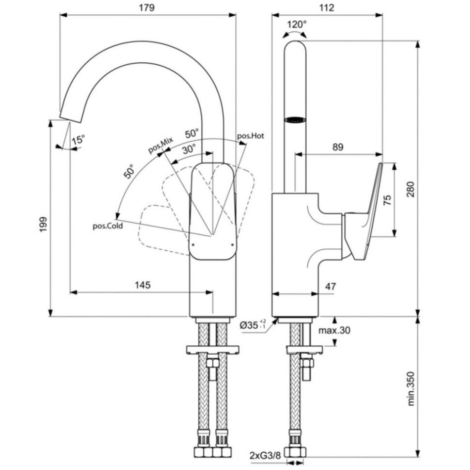 - металлическая рукоятка с индикаторами горячей / холодной воды