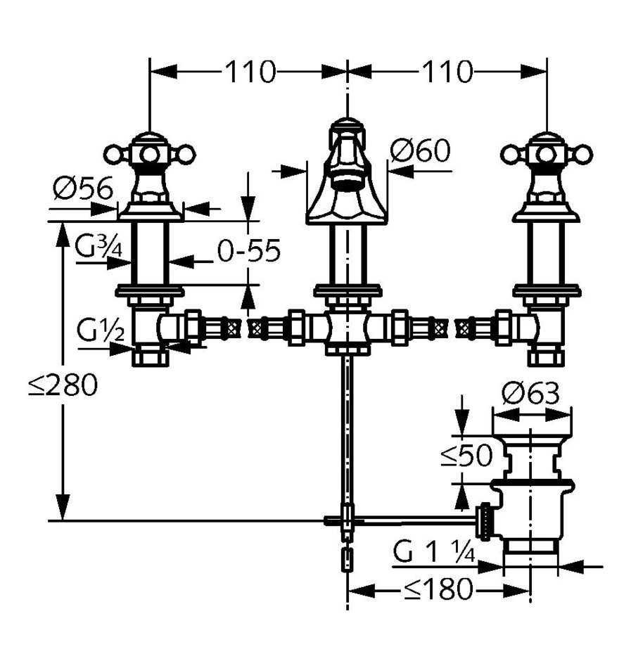 Смеситель Kludi Adlon 5104605G5 для раковины DN 15, на 3 отверстия, низкий излив, ручки хрусталь, цвет хром