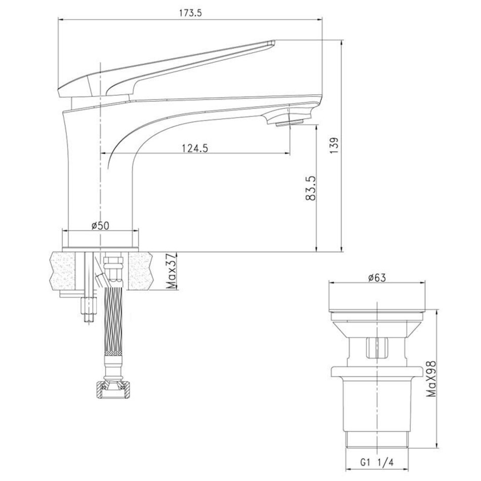 - Донный клапан 1¼", хромированный идет в комплекте и имеет нажимной механизм click-cluck
