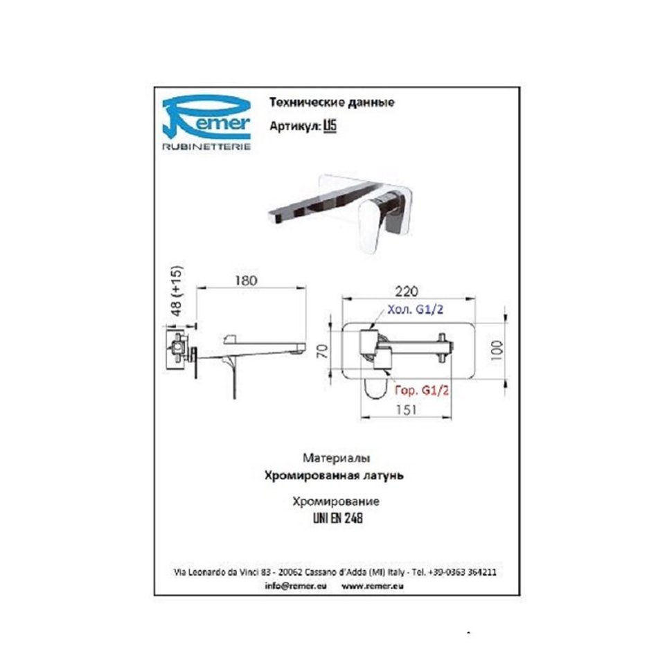 Смеситель Remer Class Line L15 для раковины, без донного клапана, цвет хром