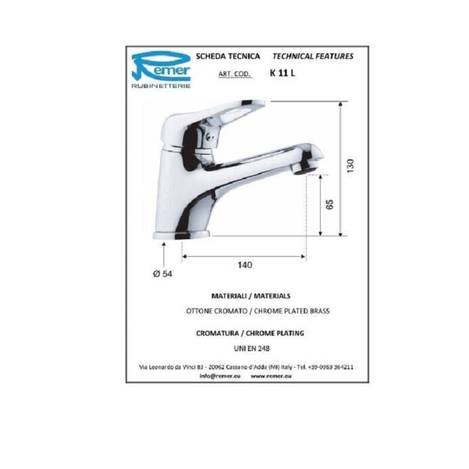 Смеситель Remer Kiss K11L для раковины, без донного клапана, цвет хром