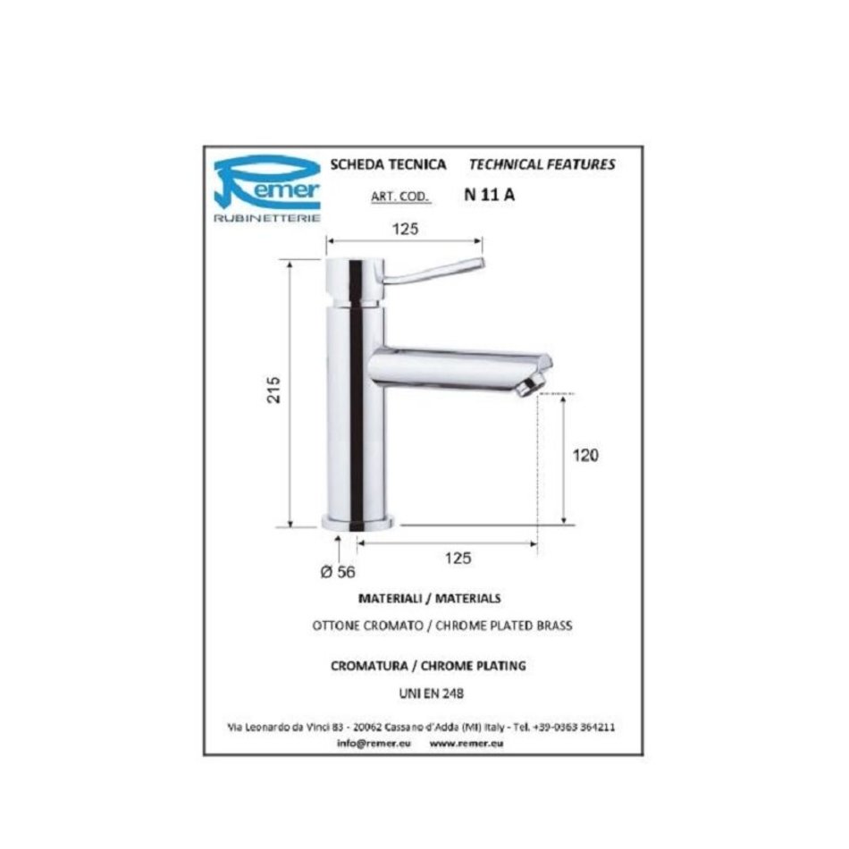 Смеситель Remer Minimal для раковины, без донного клапана, цвет хром, N11A