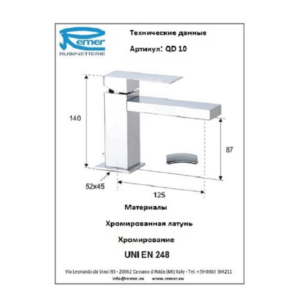 Смеситель Remer Qubika Design QD10 для раковины, с донным клапаном, цвет хром