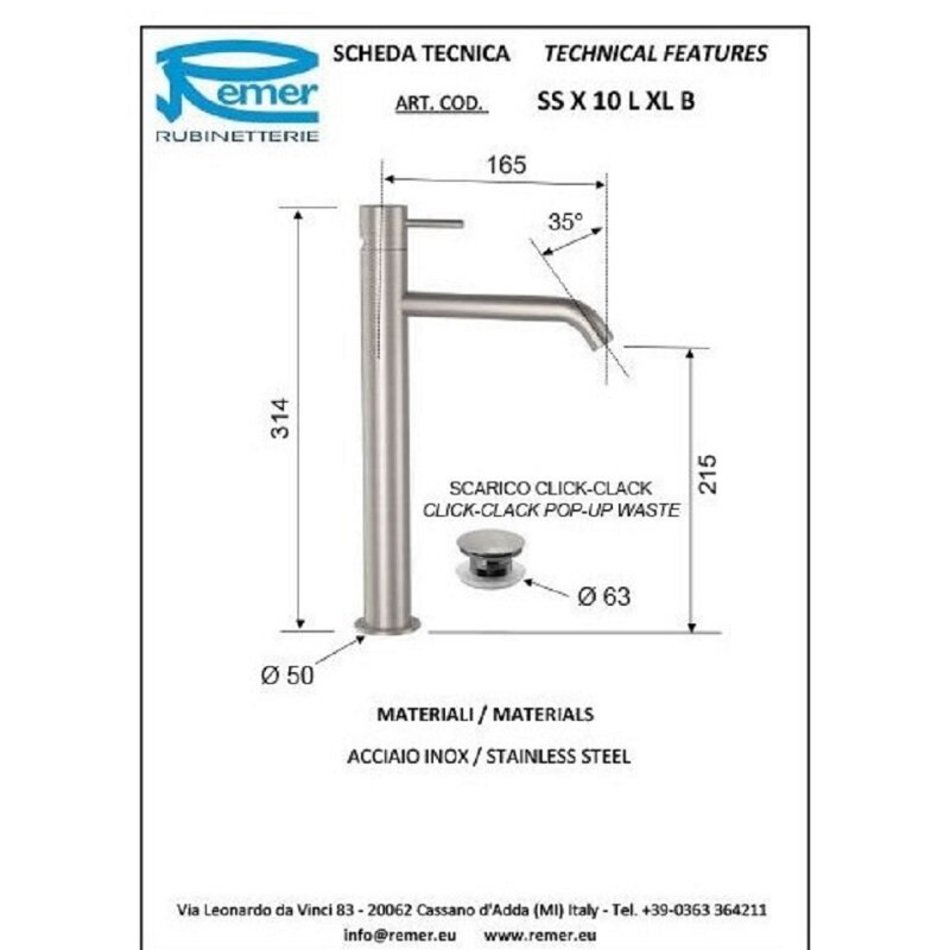 Смеситель Remer X Style Inox SSX10LXLB для раковины, с донным клапаном, цвет нержавеющая сталь