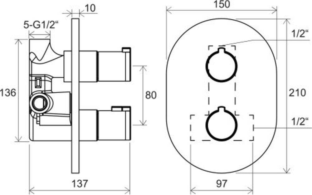 Смеситель содержит верхнюю часть, соответствующую концепции Chrome, и основной корпус из латуни, предназначенный для встраивания в стену. Термостатический смеситель скрытого монтажа можно комбинировать с другими аксессуарами RAVAK.