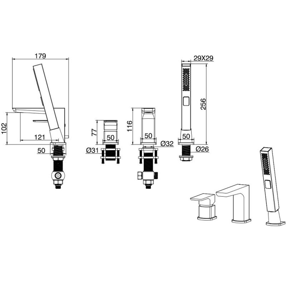 Комплектация: смеситель, излив, душевая лейка, держатель для душа, шланг