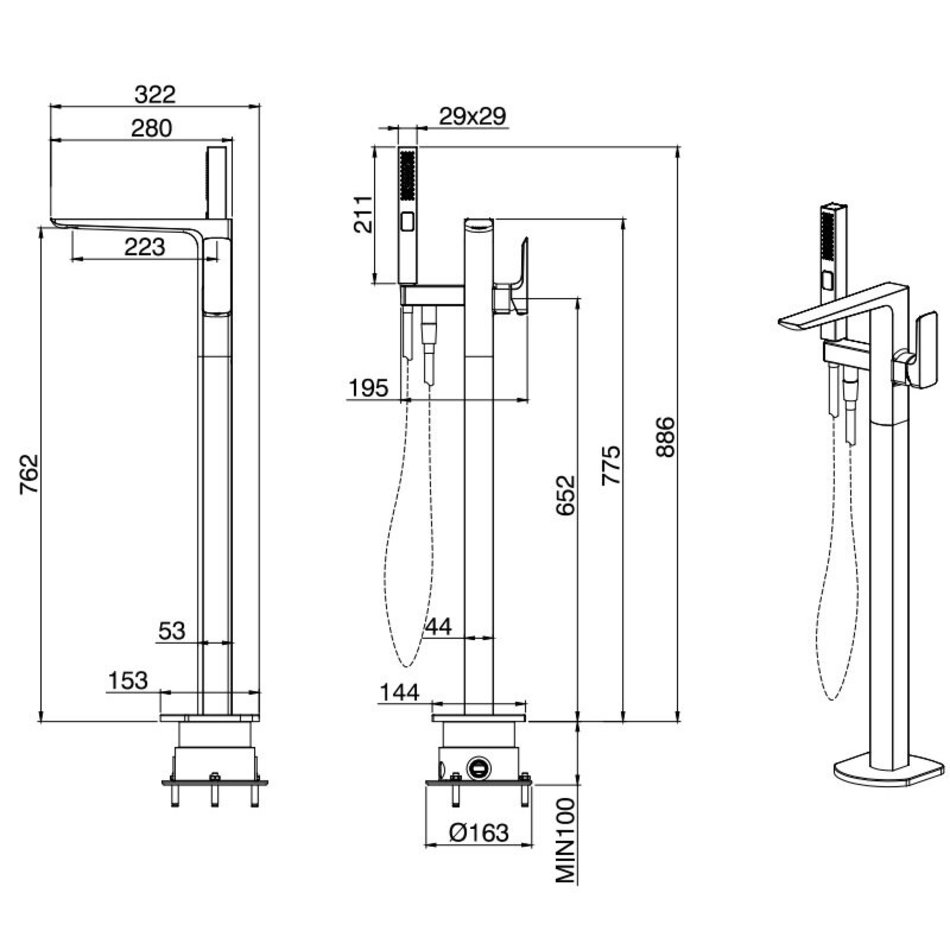 - Напольный смеситель для ванны и душа с душевым гарнитуром