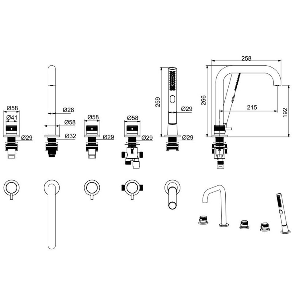 Комплектация: смеситель, излив, душевая лейка, держатель для душа, шланг
