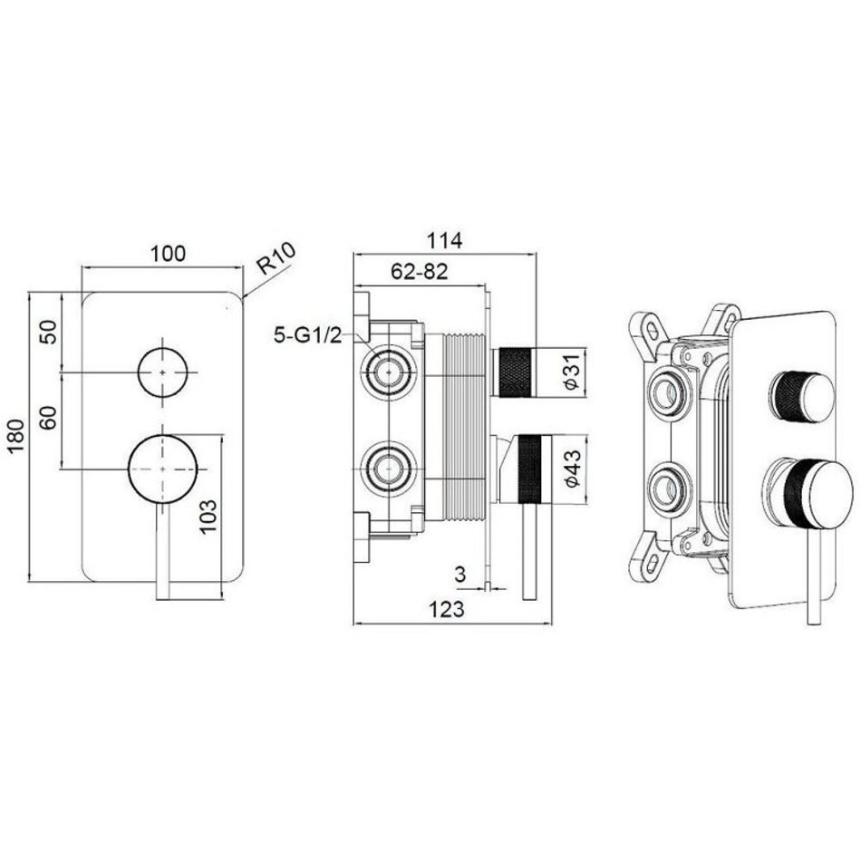 - Скрытая часть: латунь+EASY BOX, для 3х потребителей воды, дополнительно приобретается оборудование на 3 потребителя (Пример: №1 верх.душ + №2 душевой набор с водорозеткой + №3 излив или другие комбинации из 3х элементов)