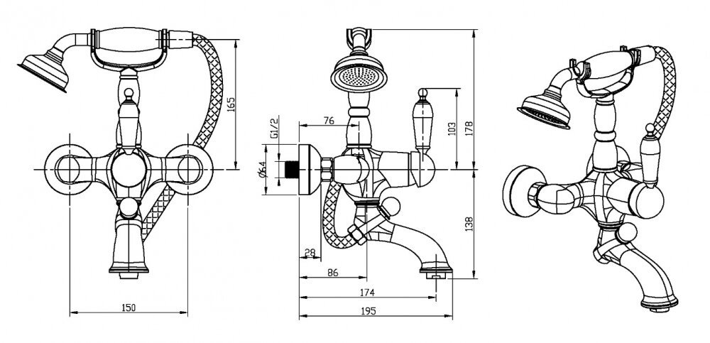 Смеситель Boheme Imperiale 323 Ripresa для ванны, с душевым гарнитуром, золото