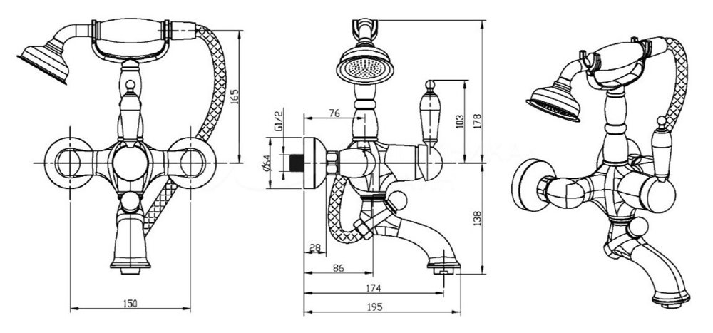 Смеситель Boheme Tradizionale 263 Cromo для ванны, с душевым гарнитуром, хром