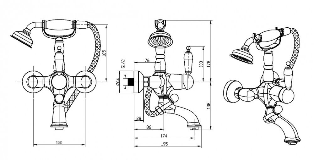 Смеситель Boheme Tradizionale 283 Oro для ванны, с душевым гарнитуром, золото