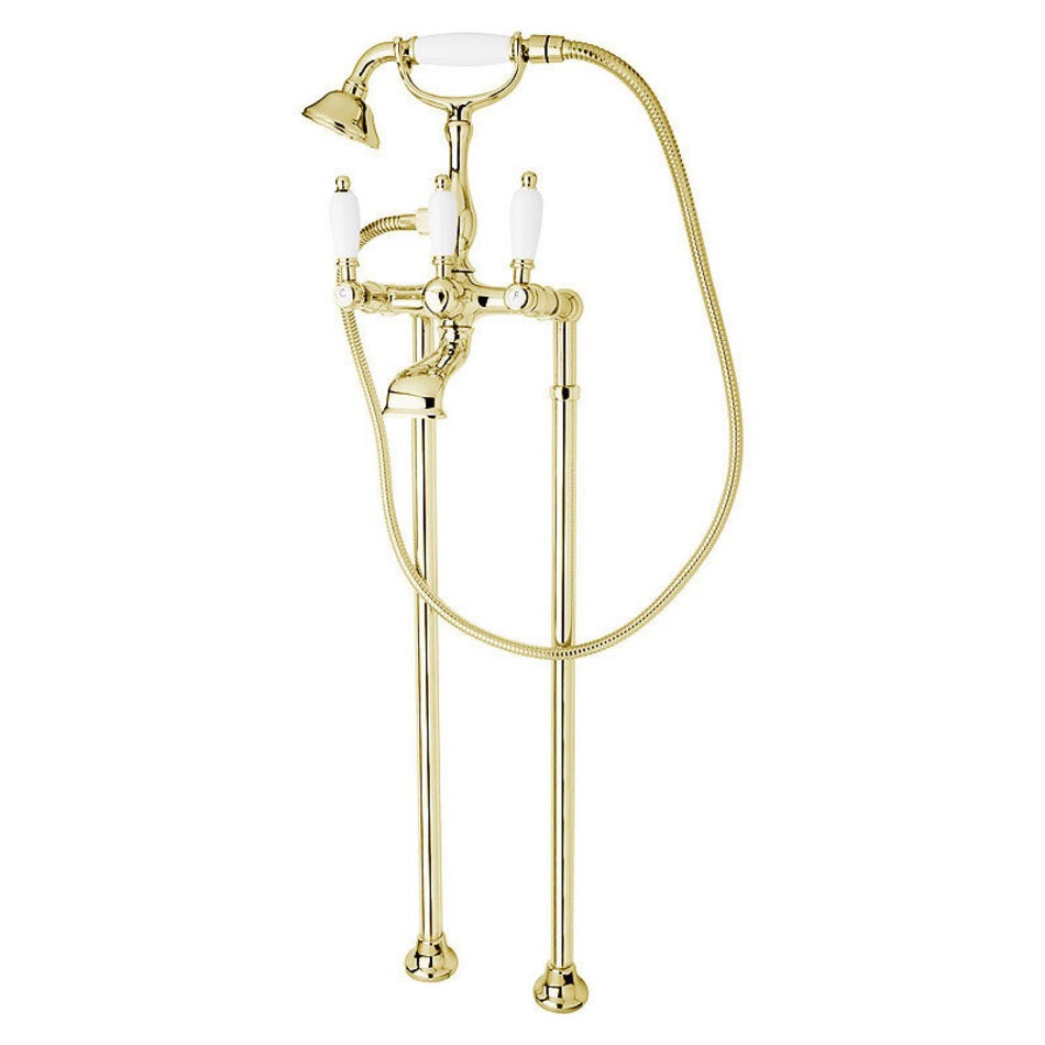 Смеситель Cezares FIRST-VDP-03/24-Bi для ванны и душа, напольный, золото 24 карат, ручки белые