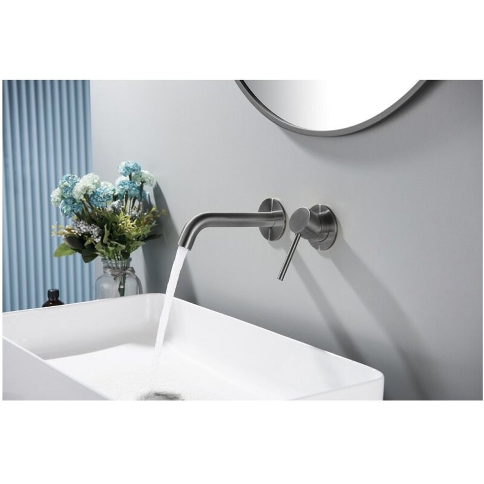Настенный смеситель для раковины (чёрное золото). Встраиваемый смеситель предназначен для монтажа в твердой или полой стене. Основные преимущества встроенного смесителя: коммуникации, крепления и механизмы спрятаны в стену и видны только декоративные элементы, установить встроенный смеситель можно в любом месте. Регулировка температуры и напора воды осуществляется одним рычагом. Сложностей монтажа не возникает при установке смесителя опытным сантехником. Внимательно изучите инструкцию по монтажу и эксплуатации.