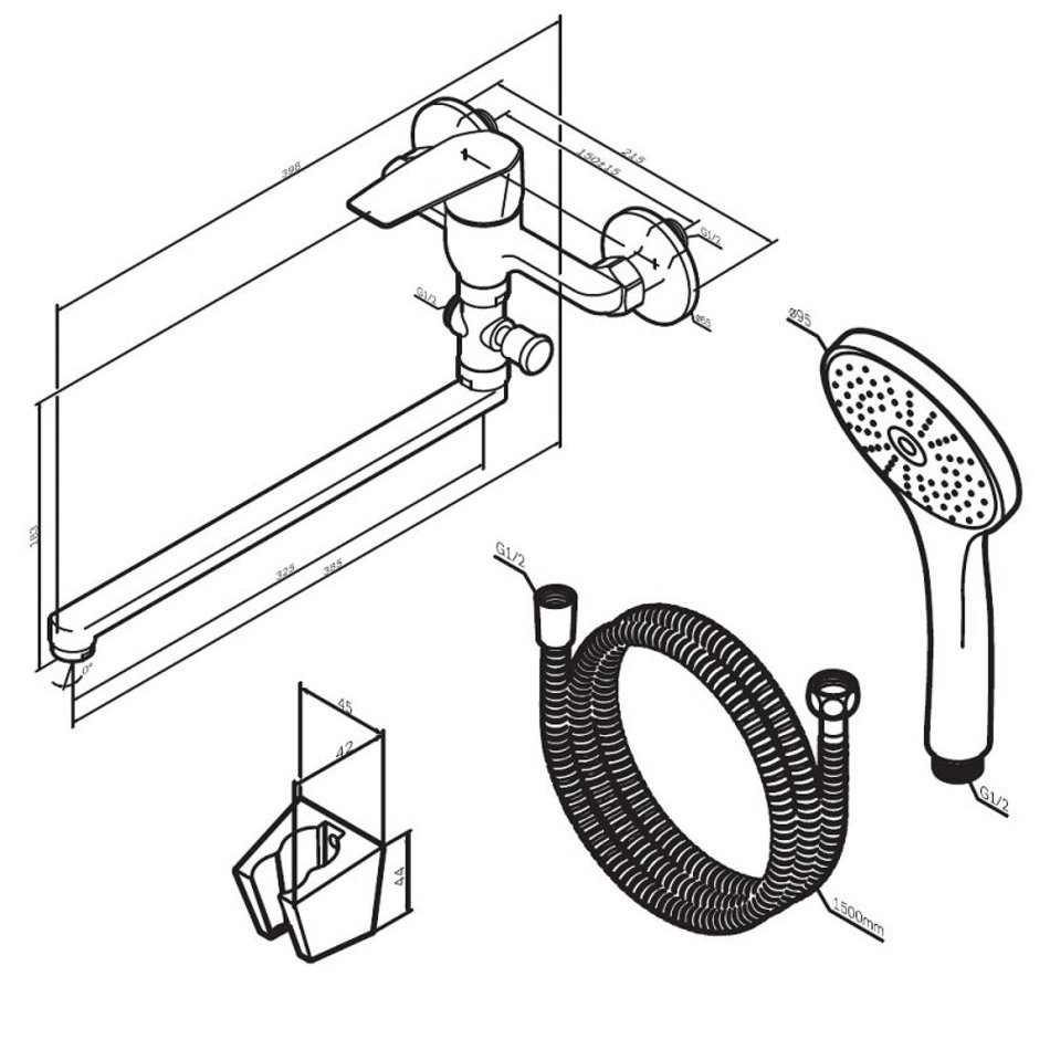 Комплектация: смеситель, шланг для душа, лейка для душа, эксцентрики, отражатели, лейкодержатель, паспорт.