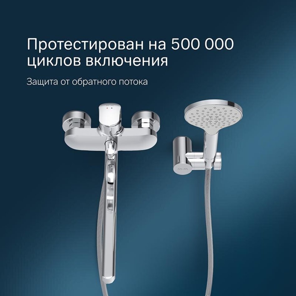 В комплекте душевой набор: стильный ручной душ 120 мм, 3 режима, настенный держатель с регулировкой угла наклона, душевой шланг с защитой от скручивания.