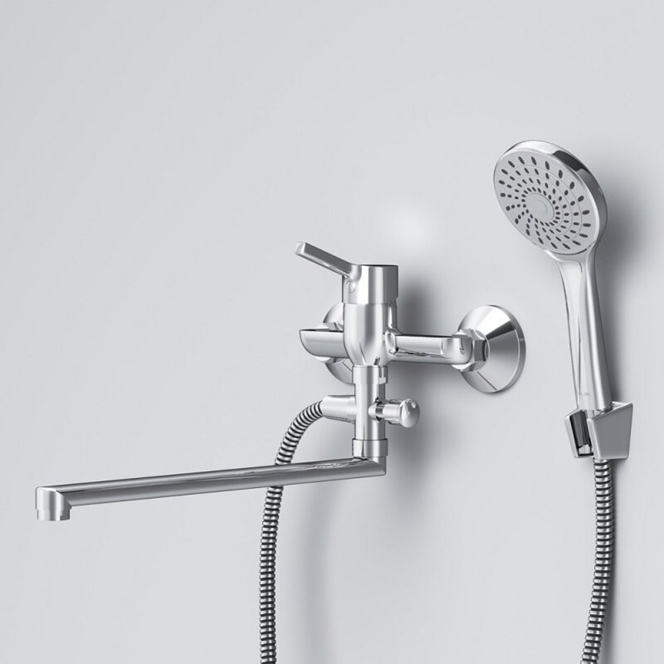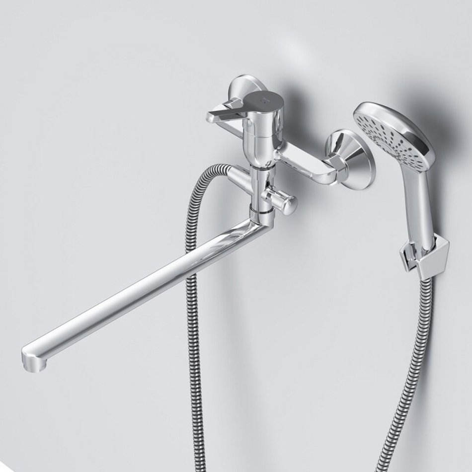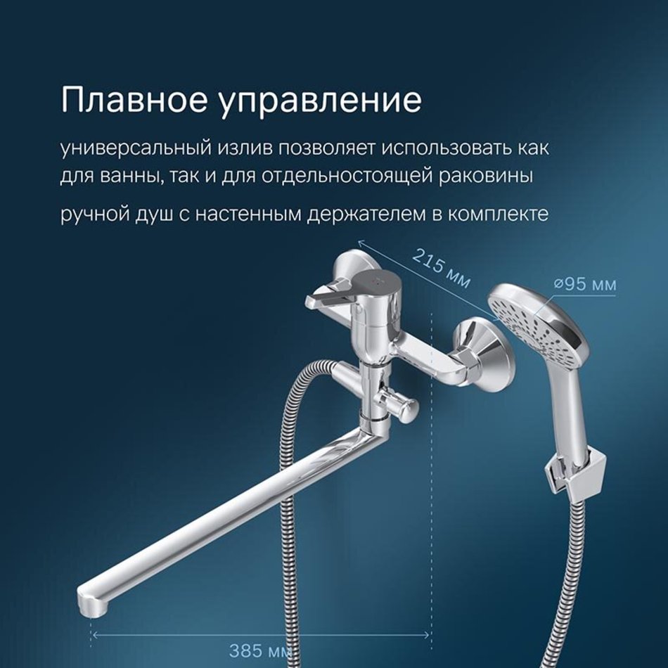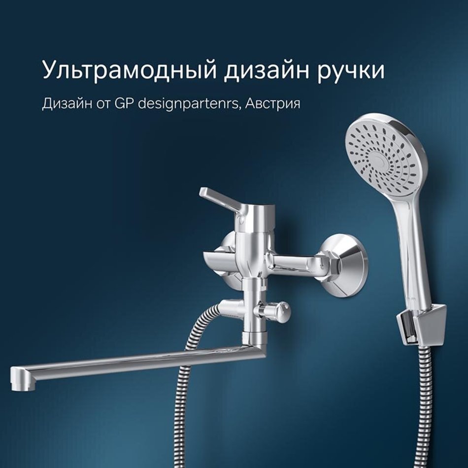 Стильное универсальное решение для ванной комнаты - качественный смеситель для ванны и душа с длинным поворотным изливом с душевым набором. Универсальный длинный излив позволяет использовать смеситель как для ванны, так и для рядом стоящей раковины. Функциональный держатель для ручного душа на два положения добавит удобства использования. Душевой шланг длиной 150 см позволит наслаждаться душем даже высокому человеку. Максимум функций за разумную плату в одном изделии! Ультрамодный дизайн ручки придает смесителю дополнительную динамику и дарит непревзойденную легкость управления. Вы почувствуете это с первого прикосновения. Точная инженерия для вашего комфорта: благодаря обширной зоне движения ручки управлять температурой воды стало еще проще.