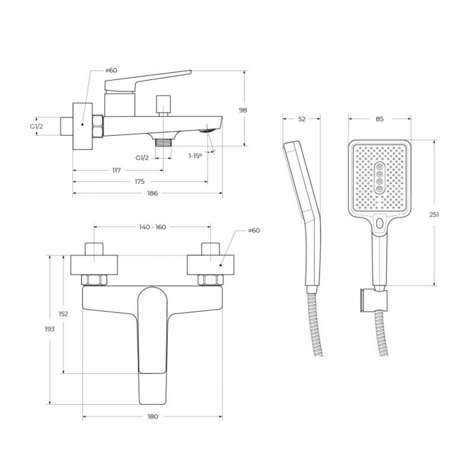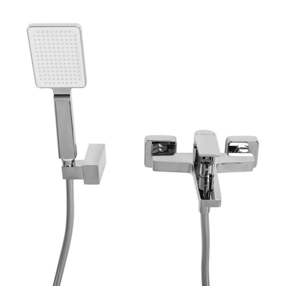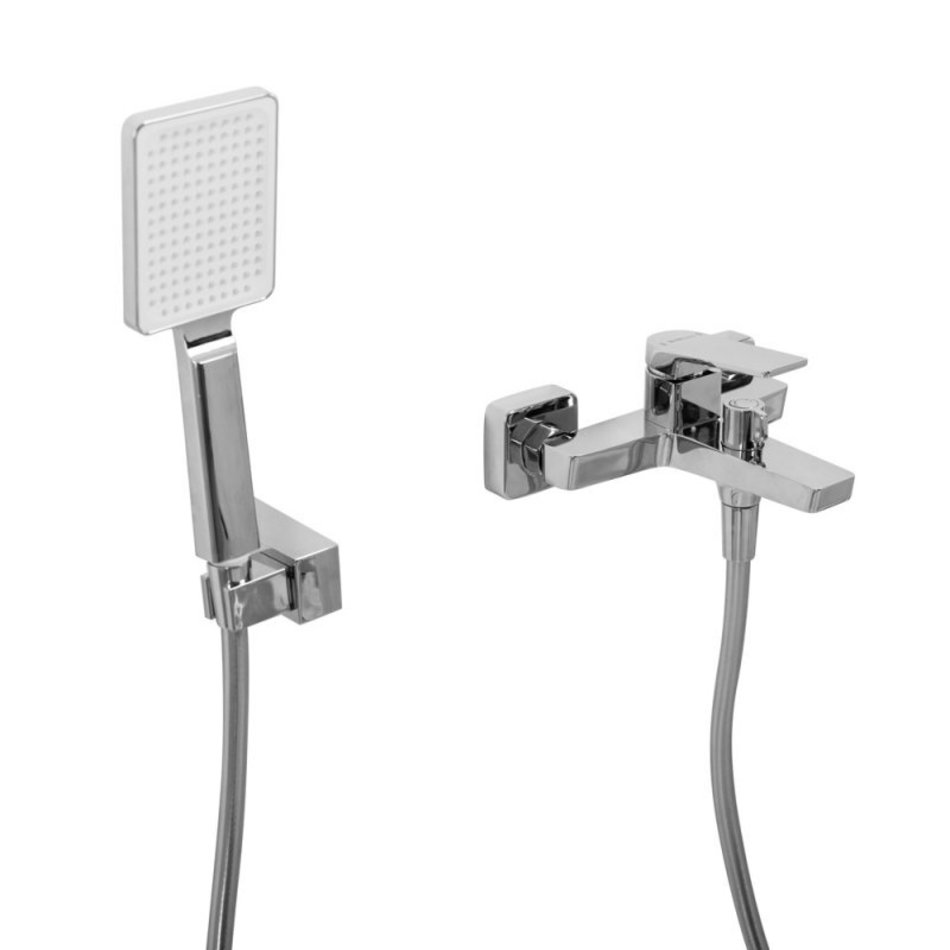 - Оснащение: душевой шланг ПВХ, ручной душ, настенный держатель ручного душа, смеситель