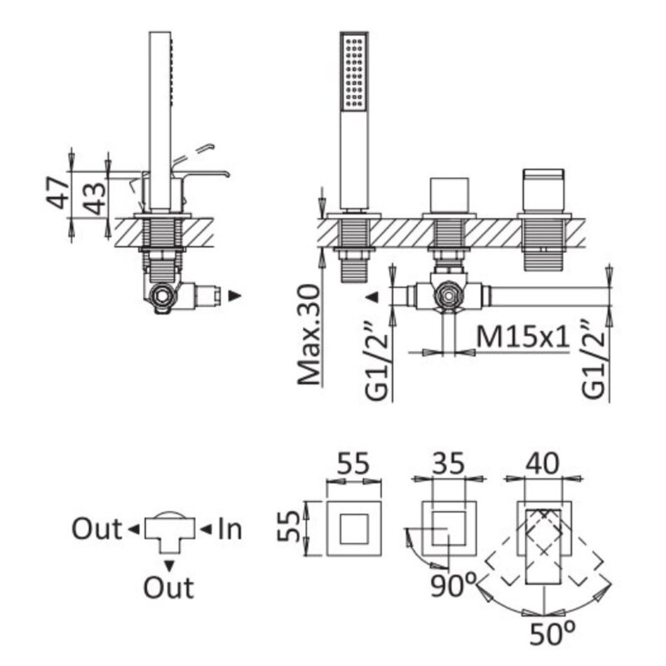 - Оснащение: душевой шланг, душевая лейка, крепления, гибкая подводка, дивертор