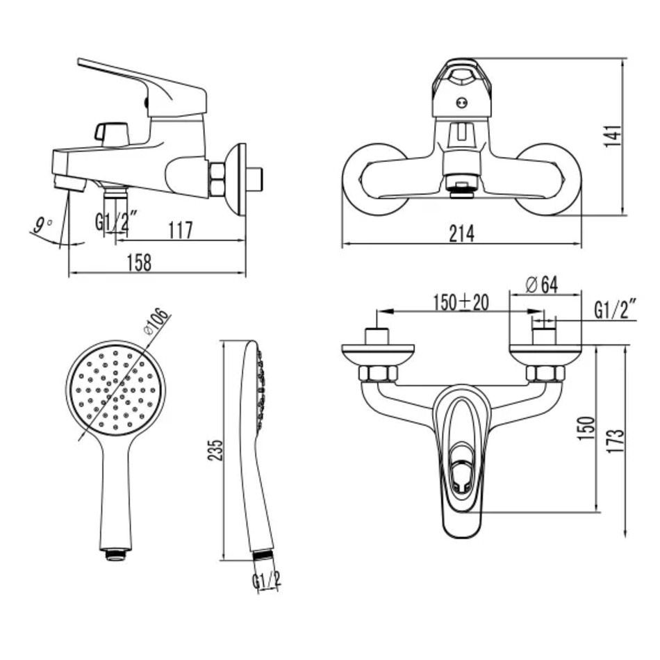 Комплект: шланг 1,5 м, настенное поворотное крепление, лейка Ø106x235 мм, комплект креплений, металлическая рукоятка.