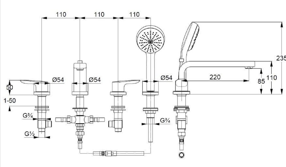 - расход воды при давлении 3 бара: излив для ванны - 22,5 л/мин; отвод для душа - 13,5 л/мин