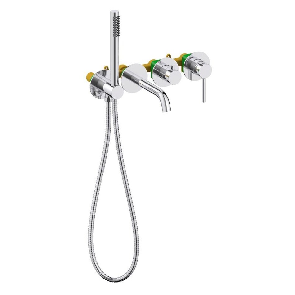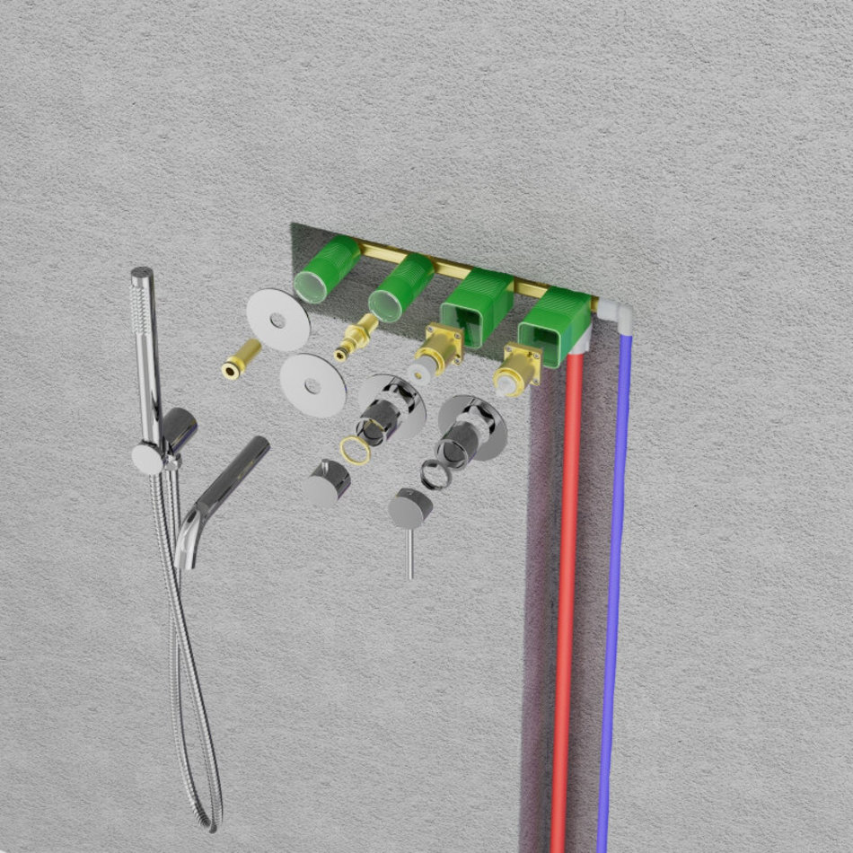 Смеситель встроенный - 1 шт. Излив встроенный (латунный) - 1 шт. Блок управления режимами, встроенный - 1 шт. Держатель ручной лейки встроенный с подключением шланга душа - 1 шт. Монтажный блок для подключения, встроенный (латунь) - 1 шт. Блок управления режимами, встроенный - 1 шт. Ручная лейка, (латунь) - 1 шт. Шланг душа 1,5 м - 1 шт. Инструкция - 1 шт.