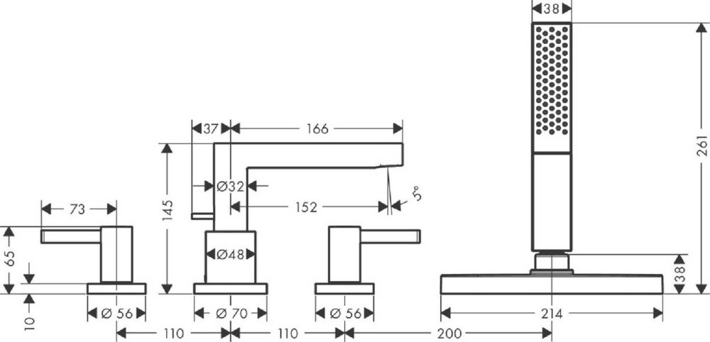 - состоит из: смеситель на край ванны, на 4 отверстия, ручной душ, держатель для душа, шланг для душа, корпус для шланга (sBox)