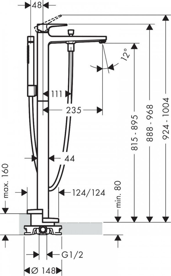 - состоит из: смеситель для ванны напольный, ручной душ-«палочка», шланг для душа, держатель для душа