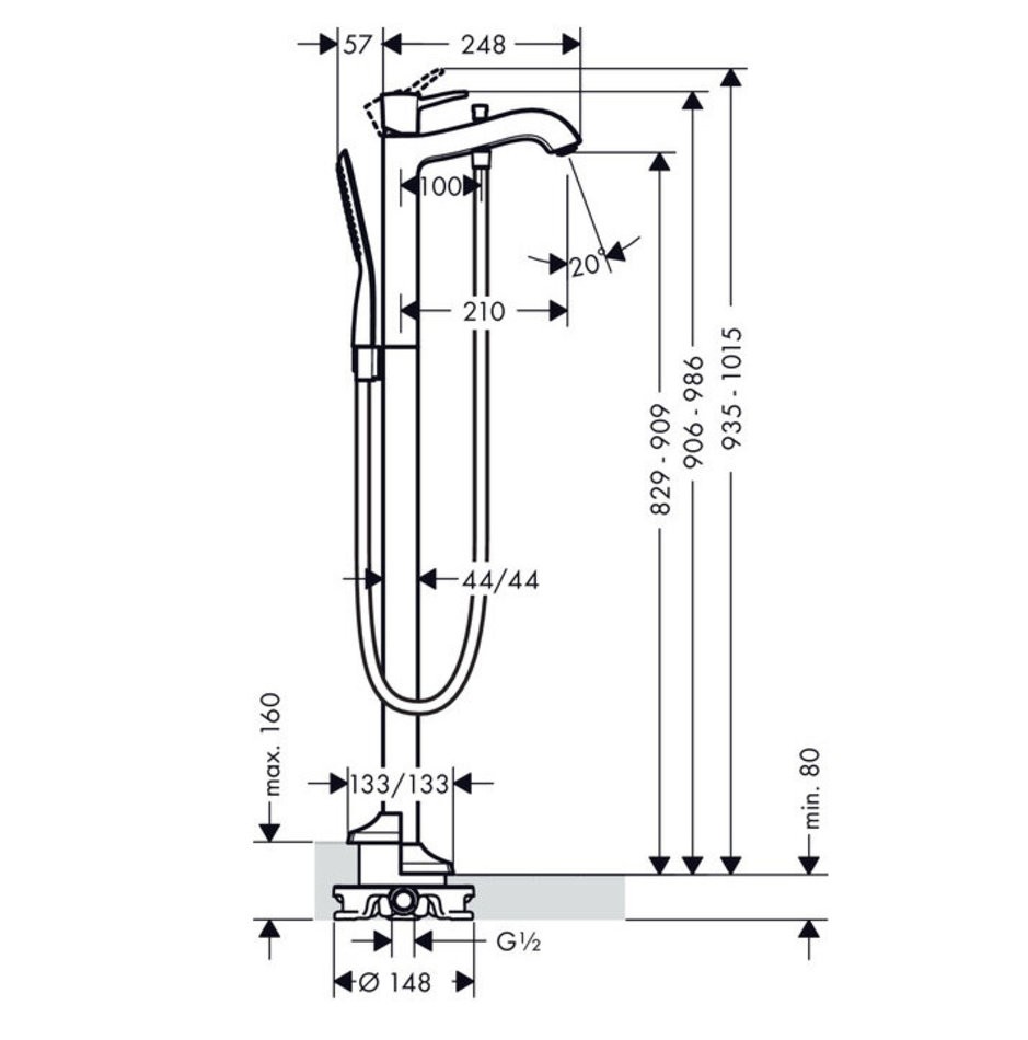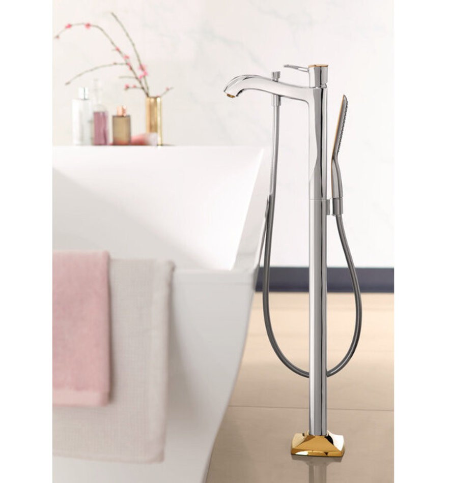 - состоит из: смеситель для ванны напольный, ручной душ-«палочка», шланг для душа, держатель для душа