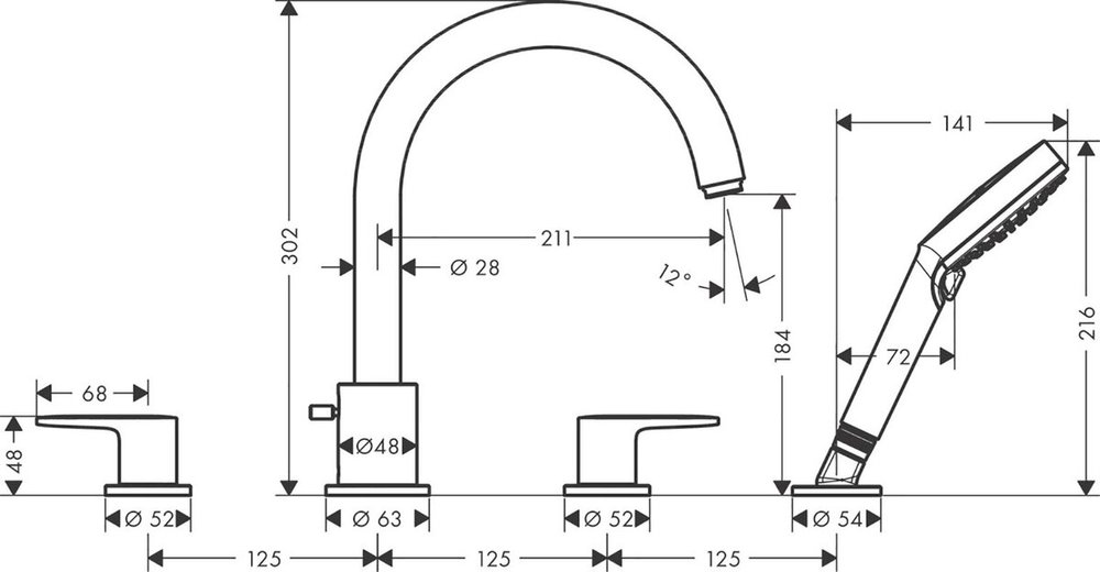 Смеситель Hansgrohe Vernis Blend для ванны и душа, на борт ванны, матовый черный, 71456670