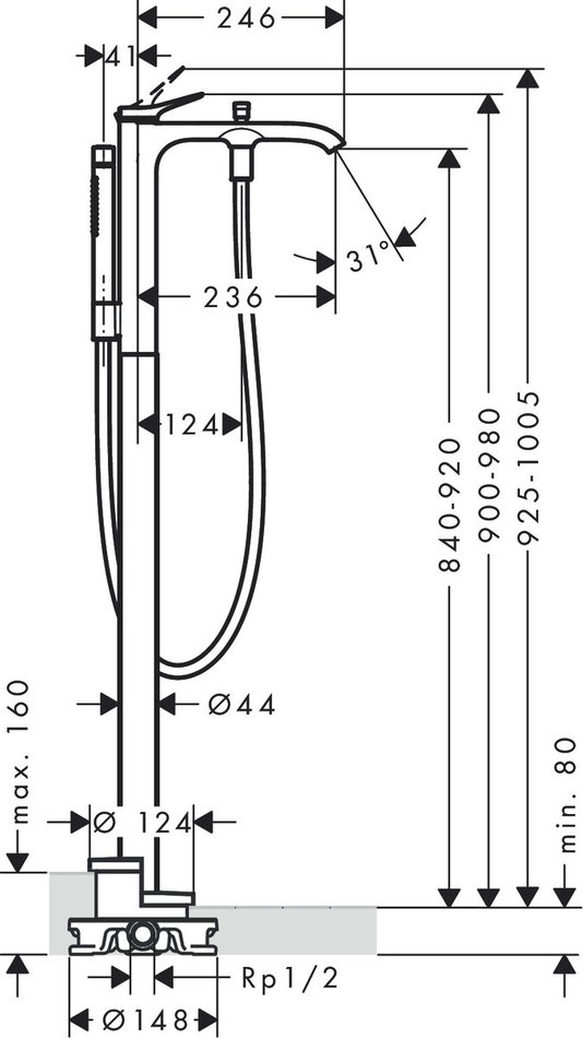 Смеситель Hansgrohe Vivenis 75445000, напольный, для ванны, с душевым гарнитуром, цвет хром