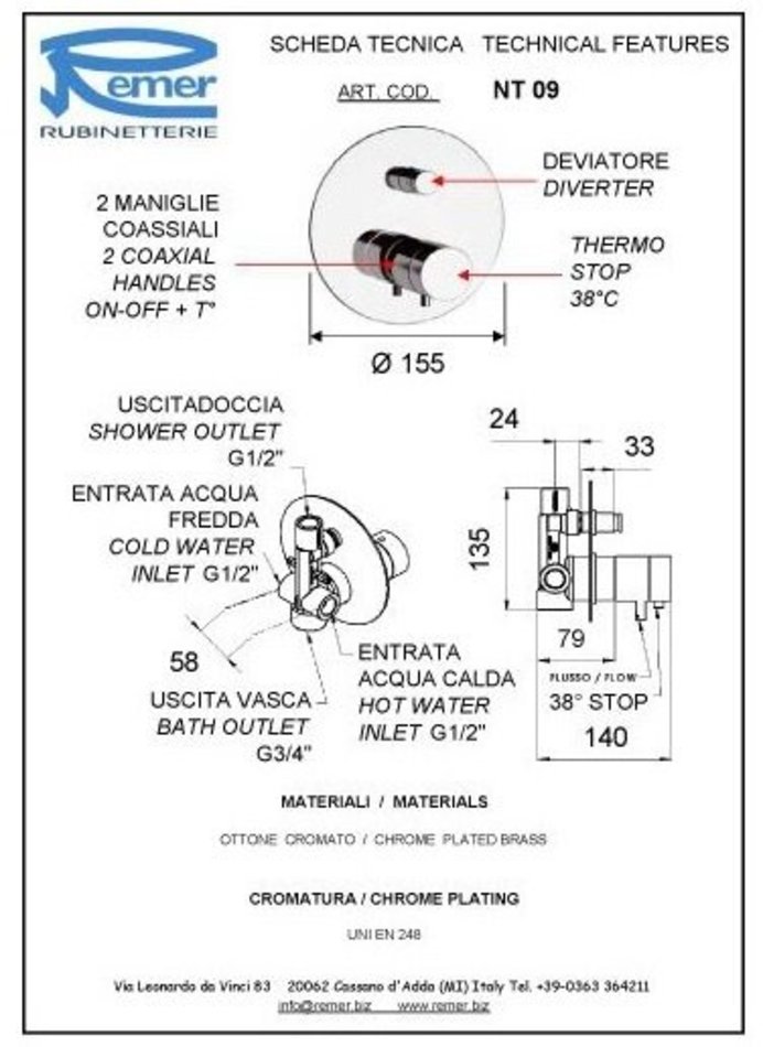 Смеситель Remer Elegance для ванны и душа, термостатический, на 2 потребителя, цвет хром, NT09
