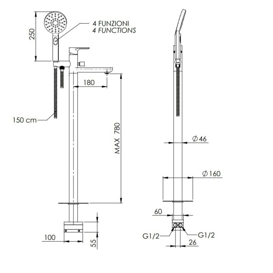 Смеситель свободностоящий, с переключателем и душевым комплектом, 4-х функциональный ручной душ из ABS с кнопкой для смены режимов, защита от известкового налета и гибкий шланг 150 см, без слива. Совместимость с проточным водонагревателем