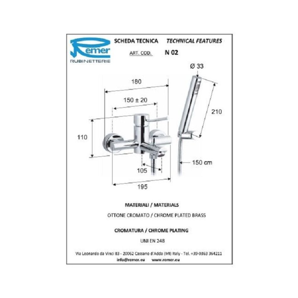 Смеситель Remer Minimal N02 для ванны и душа, с душевым гарнитуром, цвет хром