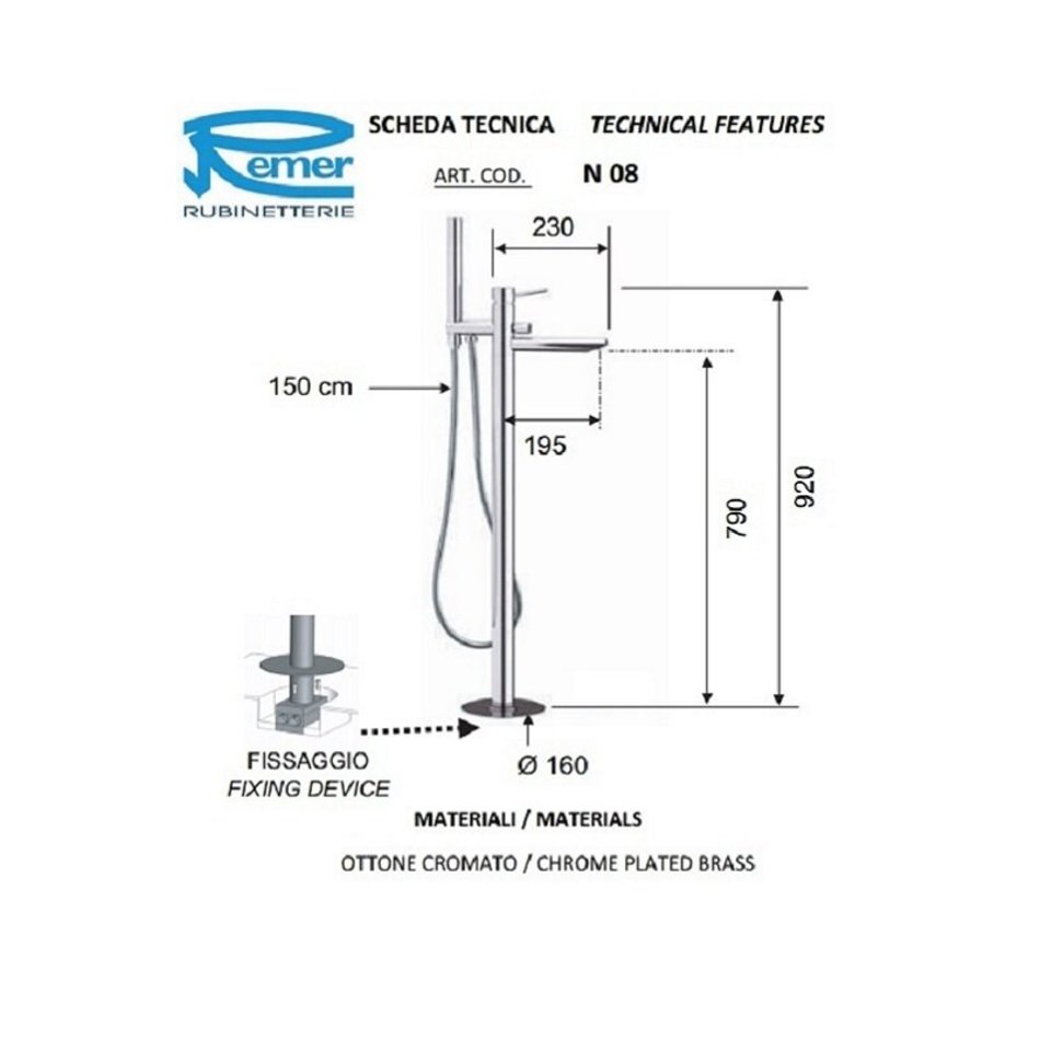 Смеситель Remer Minimal для ванны и душа, с душевым гарнитуром, цвет хром, N08