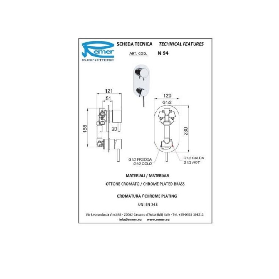 Смеситель Remer Minimal для ванны и душа, цвет хром, N94