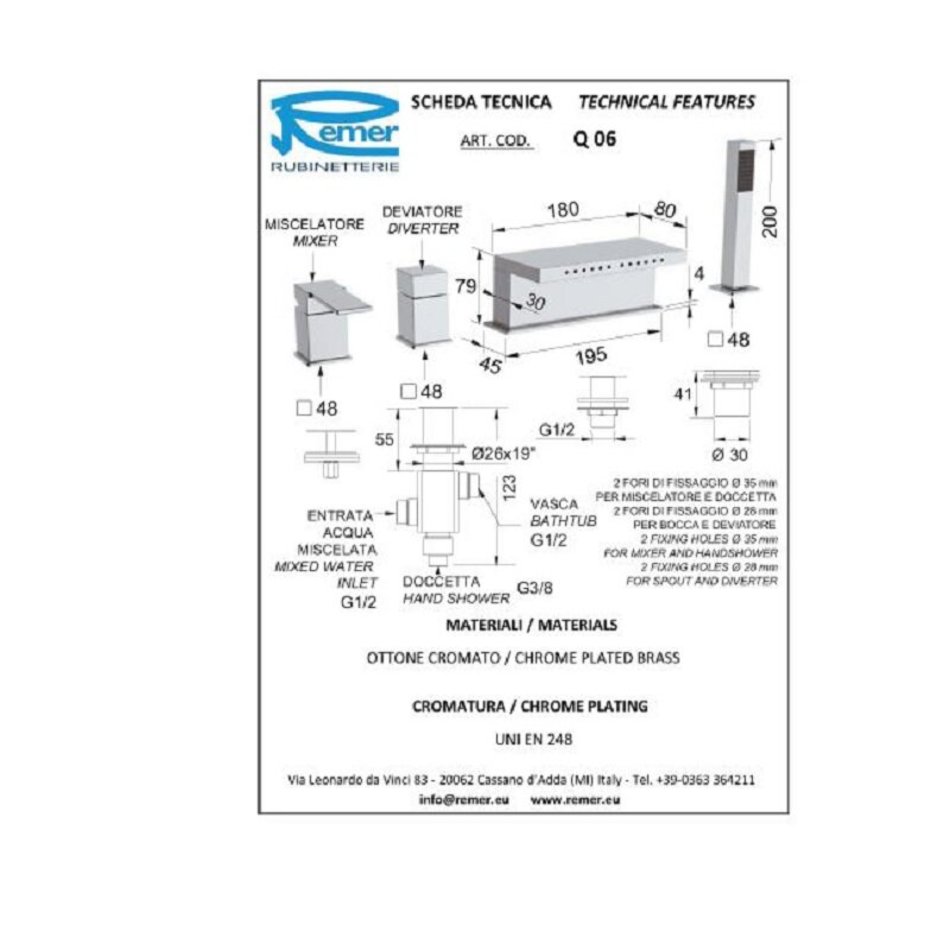 Смеситель Remer Qubika Q06 на борт ванны, для ванны и душа, цвет хром