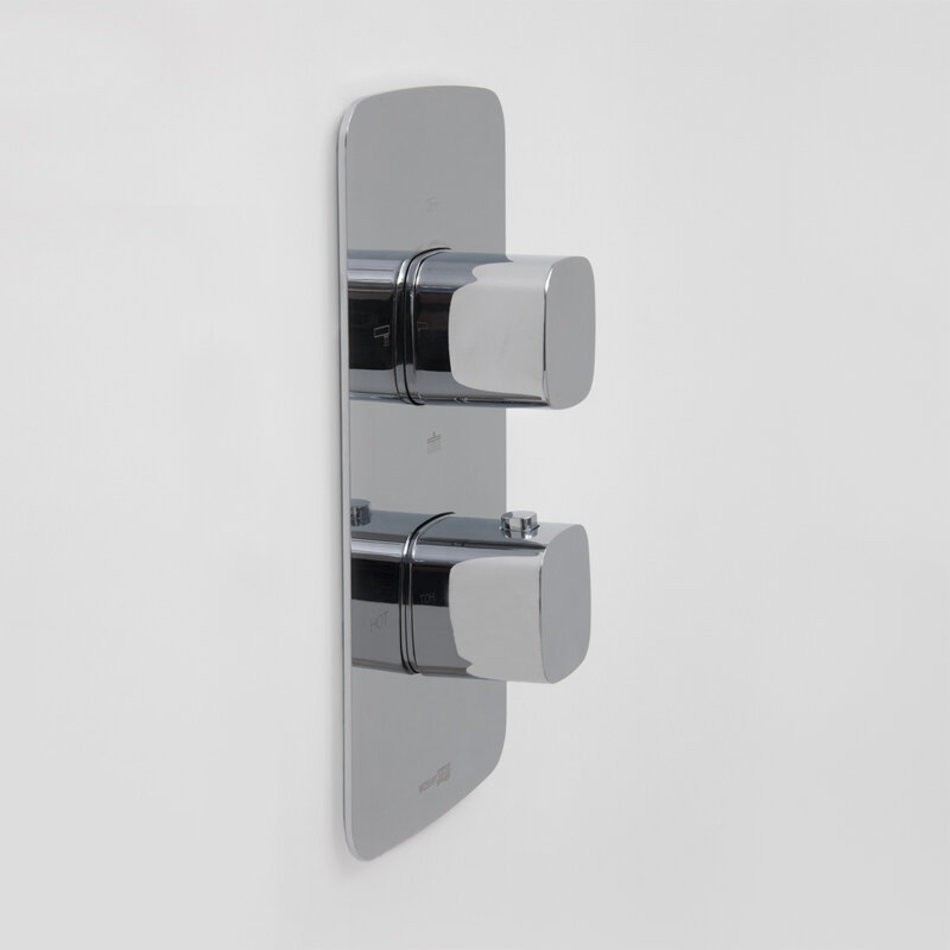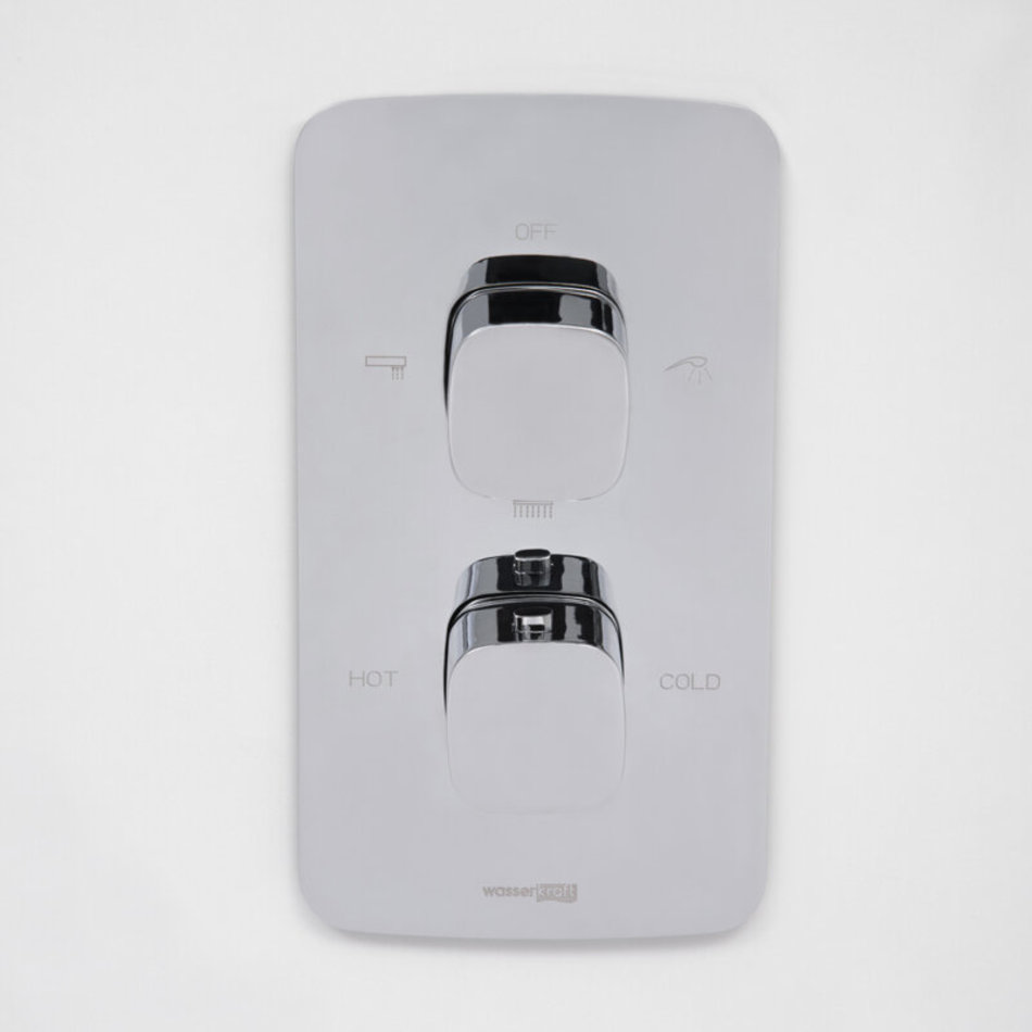 - Смеситель на 3 выхода. Подключается к трем аксессуарам для душа: верхней душевой насадке, лейке для душа и настенному изливу