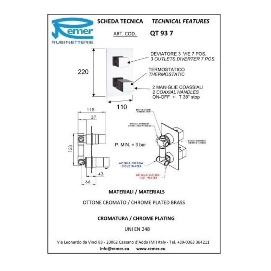 Смеситель термостатический Remer Q-Elegance QT937 для ванны и душа, на 3 потребителя, цвет хром