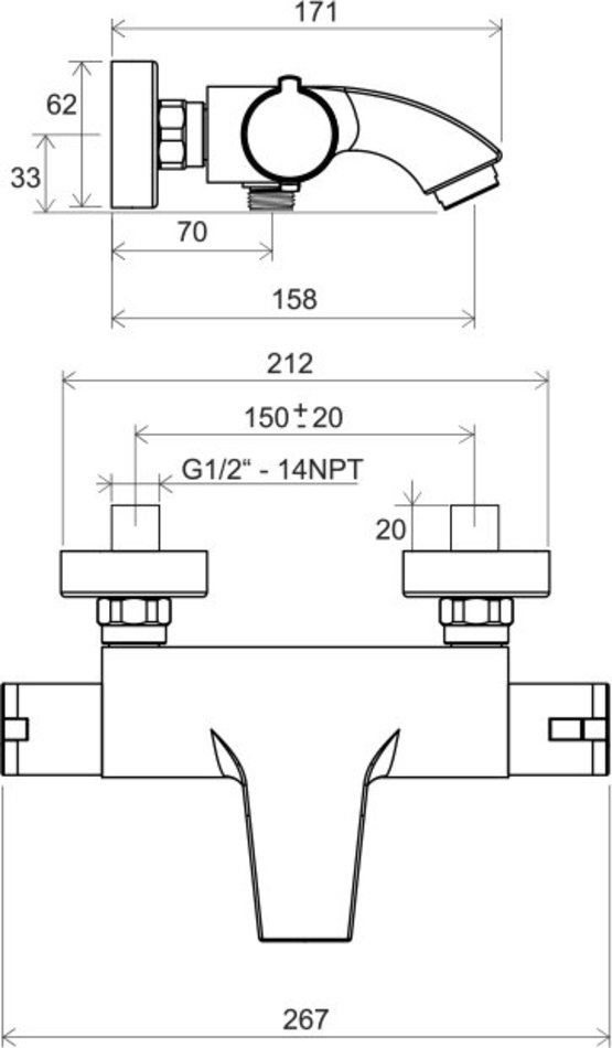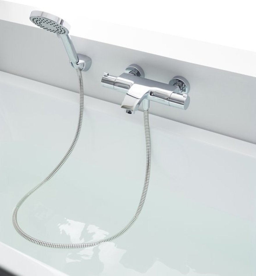 - Термостатический смеситель оснащен керамическим картриджем для регулирования напора воды и термостатическим картриджем для регулирования температуры воды