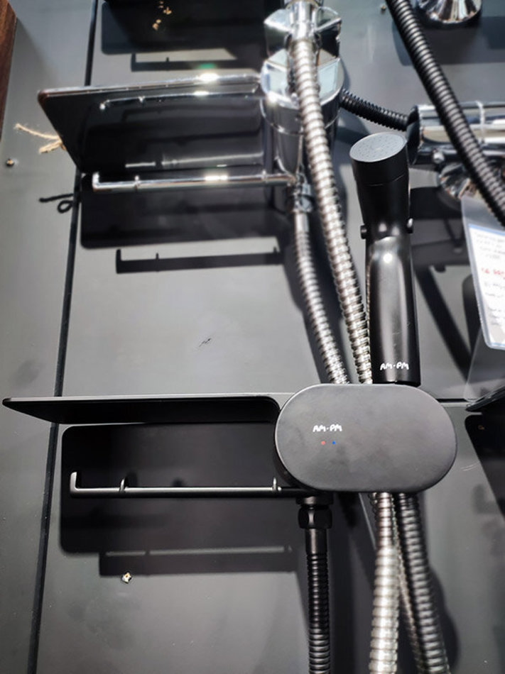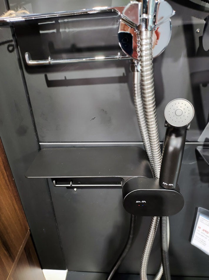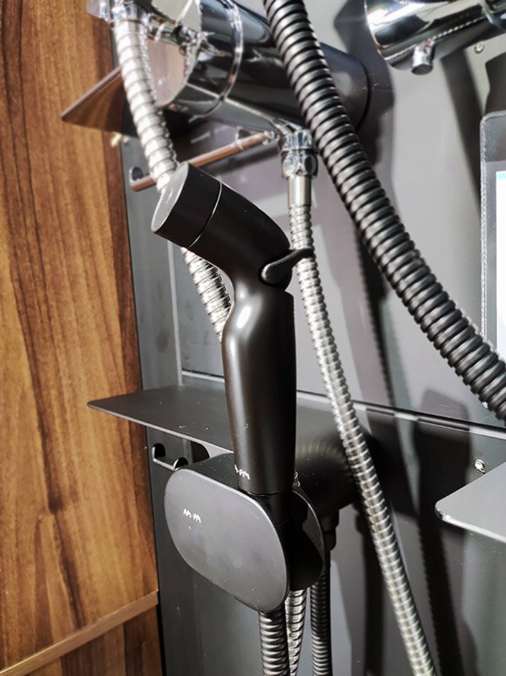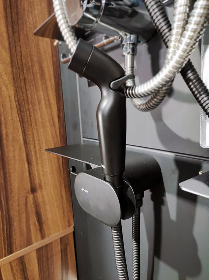 Гигиенический душ зафиксирован непосредственно в самом смесителе, что экономит пространство и выглядит лаконично.