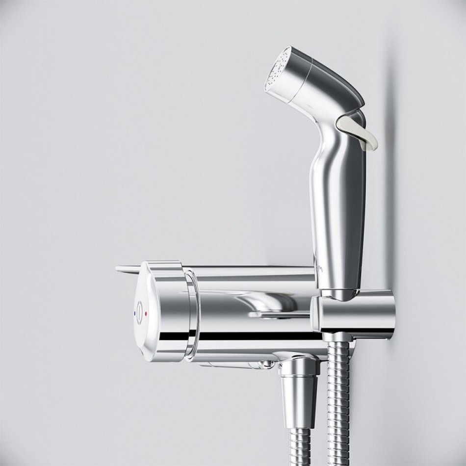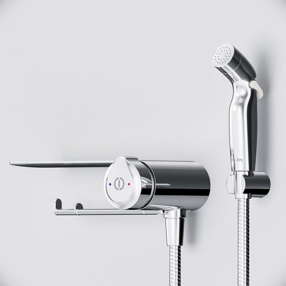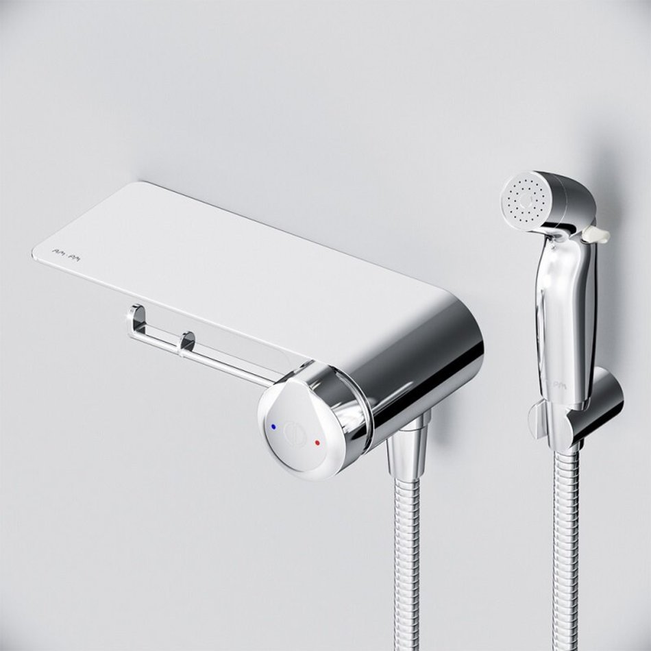 Гигиенический душ со смесителем AM.PM X-Joy TouchReel F0H85A800 с полкой, держателем для туалетной бумаги и крючком.