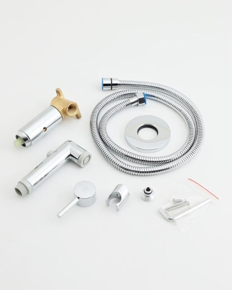 Комплектация: Накладка, внутренняя часть смесителя, внешняя часть смесителя с держателем лейки, гиг.лейка, шланг, инструкция.