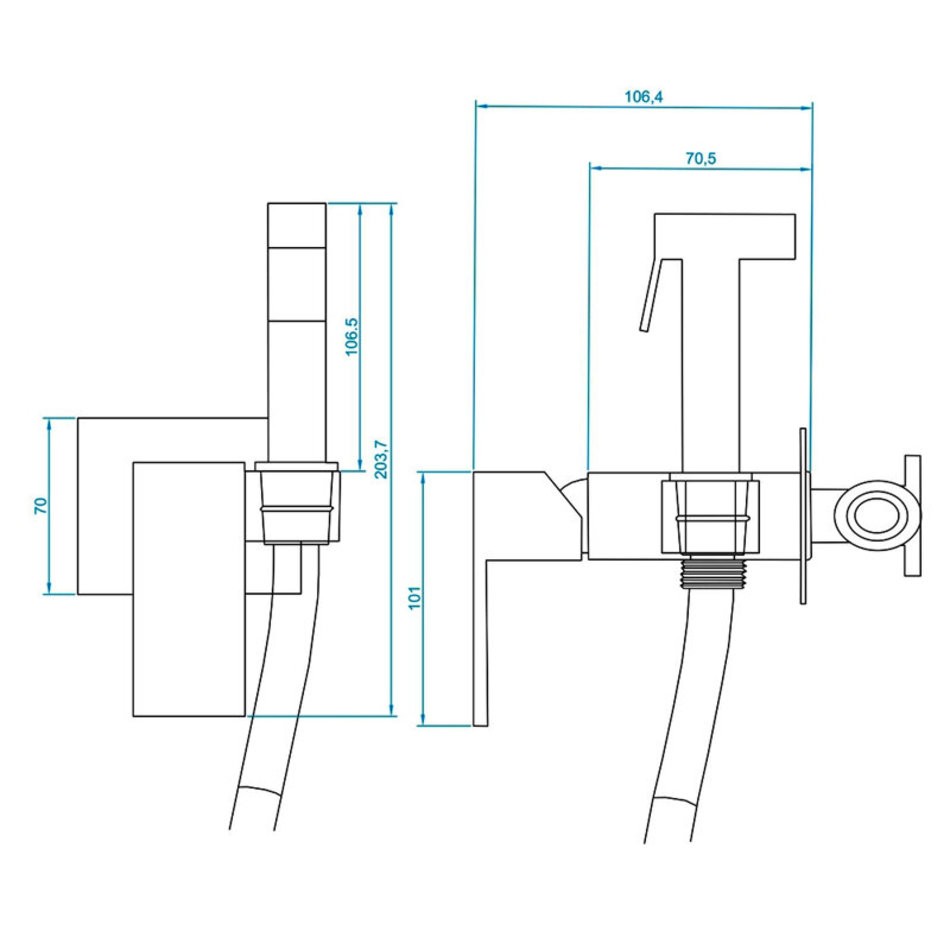 - Комплектация: смеситель, душевой шланг 120 см, гигиеническая лейка, держатель лейки