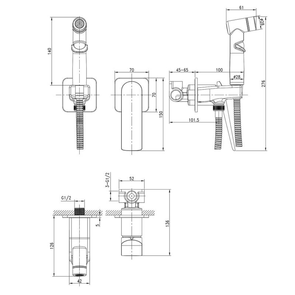 - Аксессуары в комплекте: лейка для биде с регулятором напора воды, душевой шланг 1,2 м